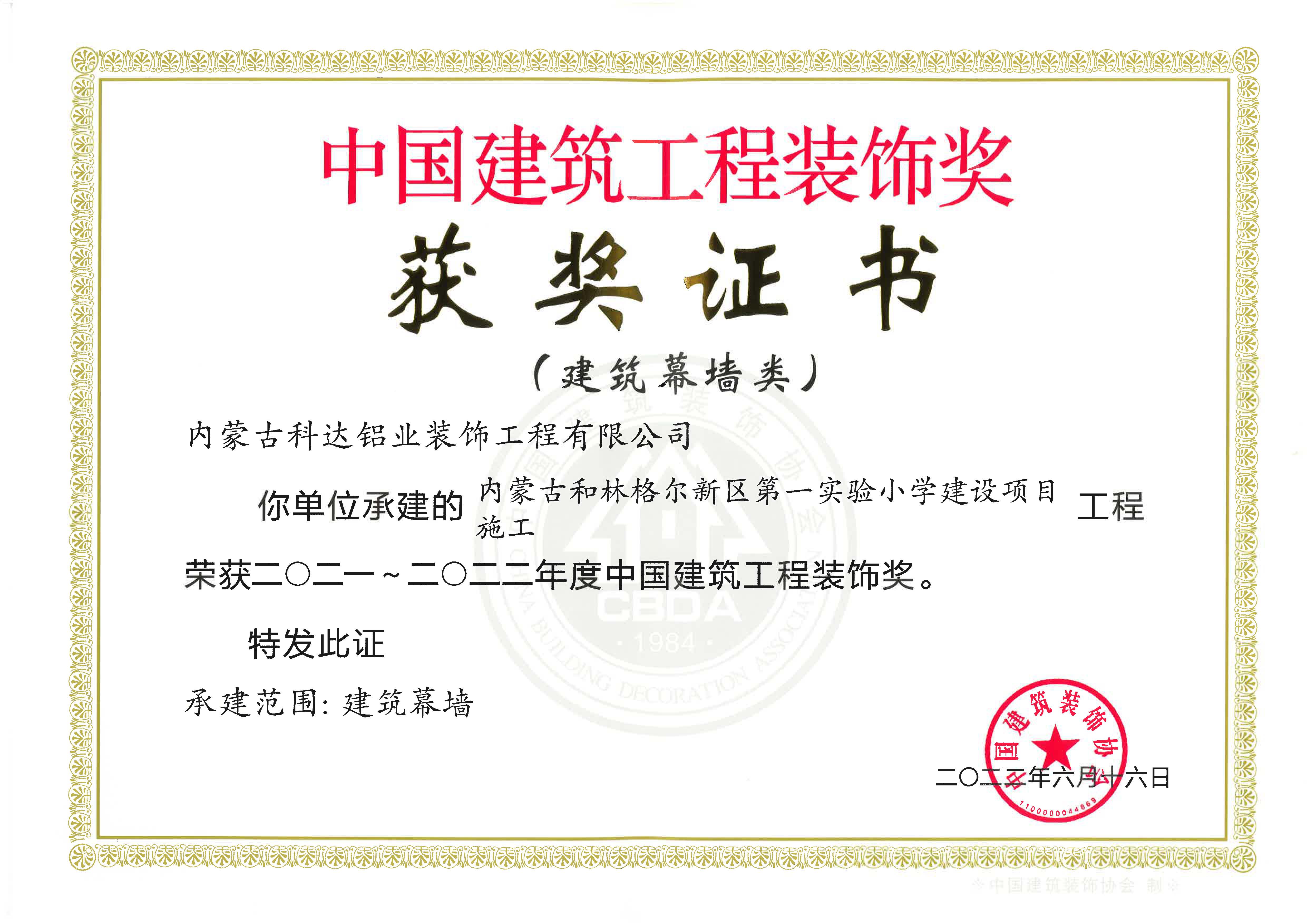 我公司承建的內(nèi)蒙古和林格爾新區(qū)第一實驗小學(xué)建設(shè)項目榮獲2021-2022年度中國建筑工程裝飾獎